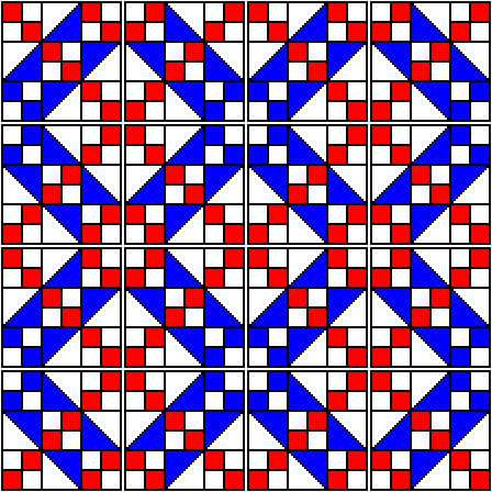 red, white and blue fabrics. The basic block is a nine patch. Alternating